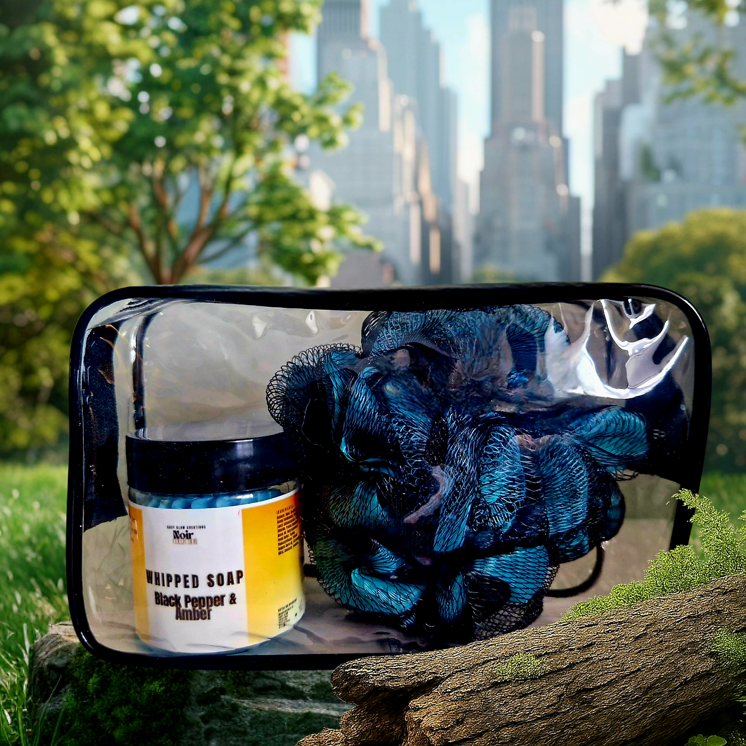 Experience the perfect balance of spicy black pepper and golden amber with our Amber & Black Pepper Whipped Soap Travel Pack. Each 80g whipped soap is infused with nourishing sweet almond oil and shea butter, leaving your skin feeling soft and moisturized. Comes with a convenient travel bag and shower scrunchie.